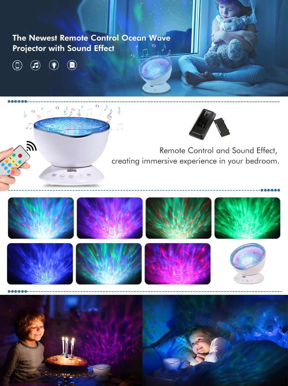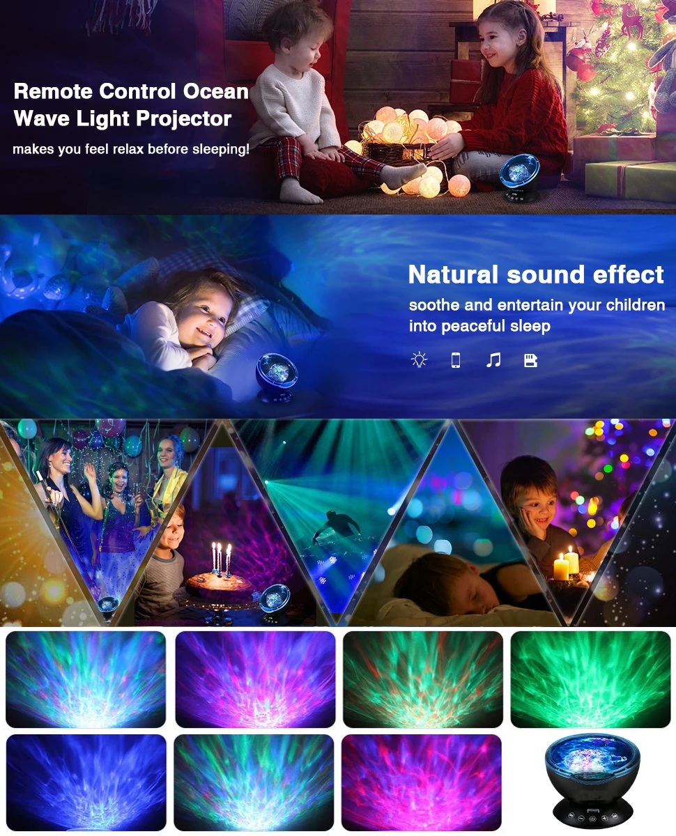 Remote Control Hypnosis Ocean Wave Night Light Projector is an upgrade Mini Projector Night light, it can Projection Colorful light on the Smooth ceiling and Wall , Creats a Romantic, Relaxation, Cozy Atmosphere